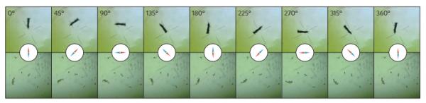 圖2. MagR在強(qiáng)磁場(chǎng)作用下指示南北,隨著磁場(chǎng)方向變化而改變自身方向。