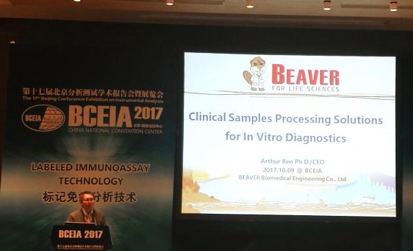 2017年10月9日,第十七屆北京分析測試學術報告會暨展覽會(BCEIA 2017),學術論壇 “標記免疫分析技術進展及其應用”在國家會議中心舉行,該論壇由解放軍總醫(yī)院生化科主任顏光濤教授主持。海貍生物醫(yī)學面向體外診斷和基因檢測領域,提供系列整體的樣本解決方案,作為生物樣本處理領域的引領者,公司CEO任輝博士受邀演講。