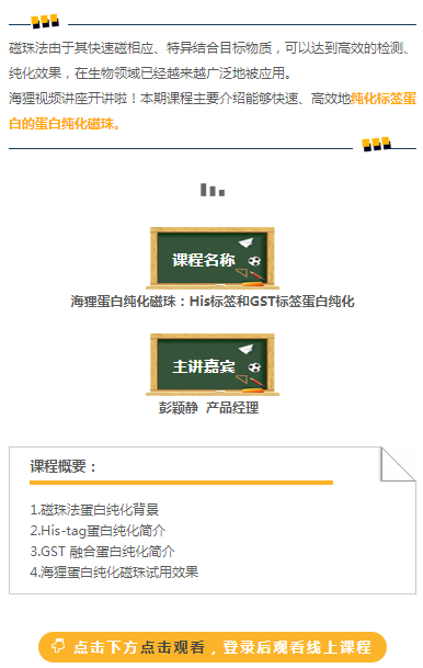 磁珠法由于其快速磁相應(yīng)、特異結(jié)合目標(biāo)物質(zhì),可以達(dá)到高效的檢測(cè)、純化效果,在生物領(lǐng)域已經(jīng)越來越廣泛地被應(yīng)用。 海貍首期直播課堂開課啦!本期課程主要介紹能夠快速、高效地純化標(biāo)簽蛋白的方法——磁珠法。